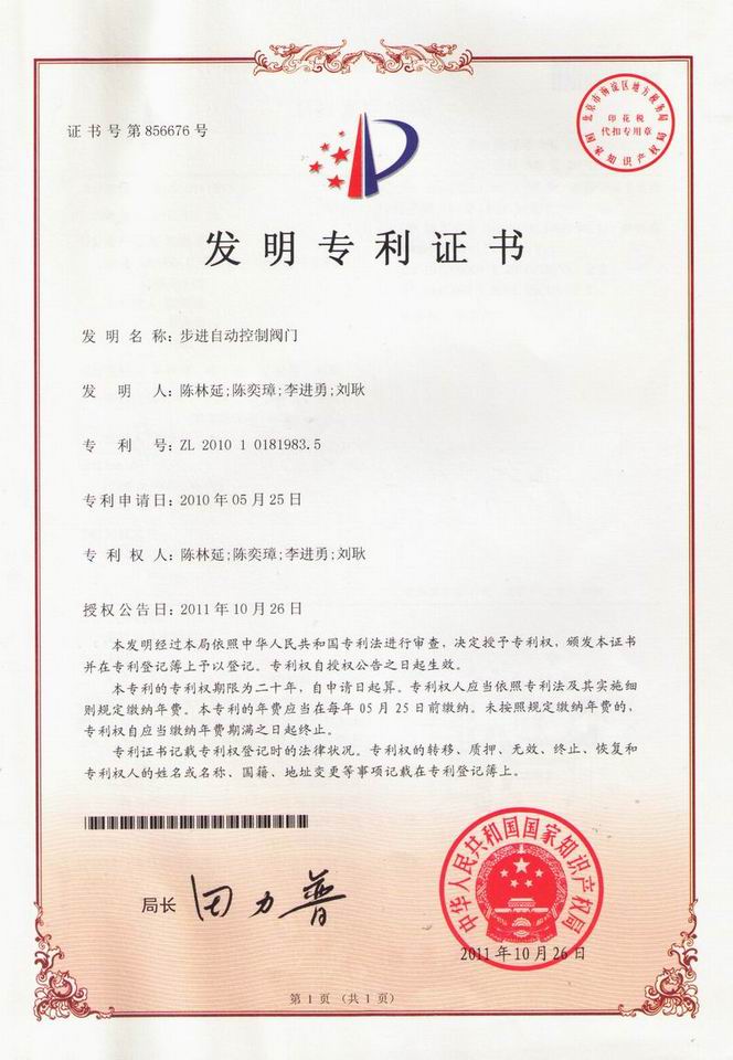經(jīng)過(guò)公司研究人員兩年多的不懈努力,刻苦鉆研“步進(jìn)自動(dòng)控制閥門”研發(fā)成功,并于2010年5月25日向國(guó)家知識(shí)產(chǎn)權(quán)局申請(qǐng)專利保護(hù)。國(guó)家知識(shí)產(chǎn)權(quán)局經(jīng)過(guò)實(shí)質(zhì)性審查,于2011年10月26日授予專利權(quán)并頒發(fā)發(fā)明專利證書(shū)。