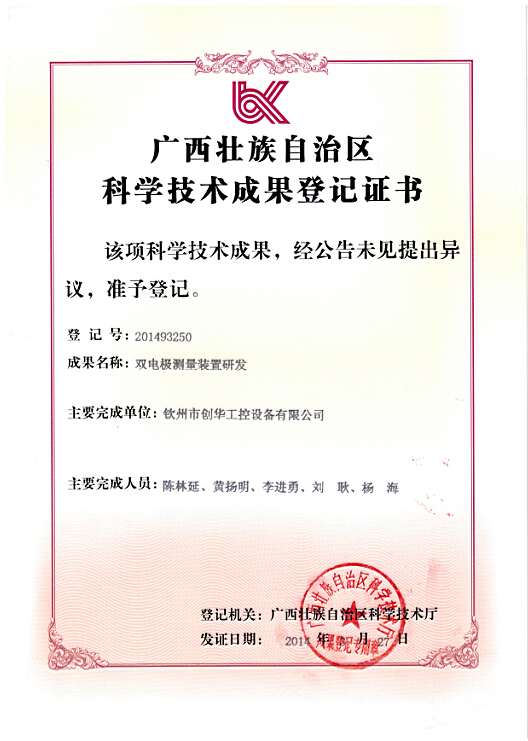 2014年1月20日,欽州市科學(xué)技術(shù)局組織有關(guān)專(zhuān)家對(duì)欽州市創(chuàng)華工控設(shè)備有限公司所承擔(dān)的“雙電極測(cè)量裝置研發(fā)”進(jìn)行項(xiàng)目成果鑒定,鑒定委員會(huì)專(zhuān)家查閱了相關(guān)材料,聽(tīng)取了承擔(dān)單位項(xiàng)目介紹,進(jìn)行了質(zhì)疑答辯,經(jīng)過(guò)認(rèn)真討論認(rèn)為本項(xiàng)目利用高新技術(shù)改造傳統(tǒng)制糖產(chǎn)業(yè),有利于促進(jìn)我國(guó)制糖行業(yè)的技術(shù)裝備水平的提升,研究成果達(dá)到了國(guó)內(nèi)領(lǐng)先水平。