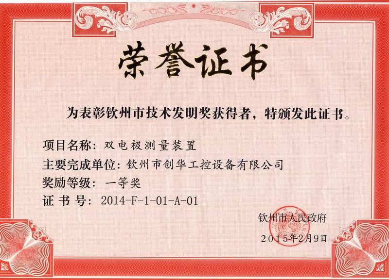 2015年12月30日下午3:00市委、市政府在市行政中心C座會議廳召開2015年欽州市科學(xué)技術(shù)獎勵大會暨促進科技成果轉(zhuǎn)化行動推進會,我公司產(chǎn)品《雙電極測量裝置》喜獲2014年度欽州市技術(shù)發(fā)明一等獎。